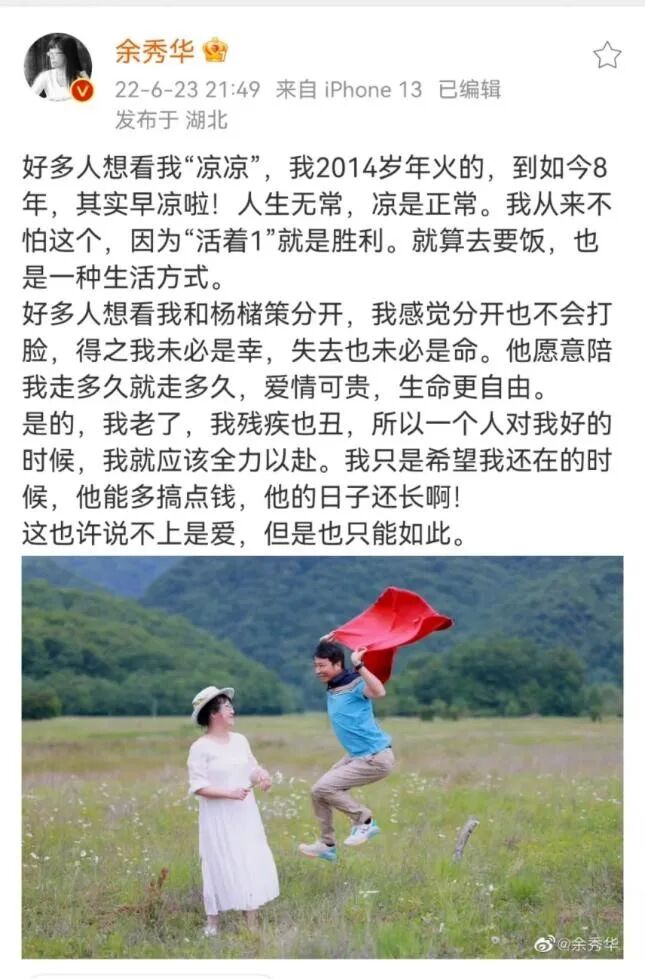 可是,这样一个洞悉世事貌似强大的余秀华,却突然间栽了这么大一个跟头!如果说第一次婚姻是父母之命,由不得她;那这次作为经济独立的著名才女,责任完全要由自己承担了啊,其杀伤力简直致命!下午五点多,我在微博搜索关键词,没有搜到任何消息。晚上忙完回去躺下再刷微博,“余秀华直播中与丈夫激烈争吵”已经上了热搜,铺天盖地。余秀华恋爱结婚的过程,我知道一点,毕竟我喜欢她嘛,自然少不了关注。但我从来没想到送她“祝福”这个词,每次看到她与他的消息,我的心都会提起来,很清楚早晚有一天要崩盘,但着实想不到会来的这么快。我有两个和我一样喜欢余秀华的女朋友,我们时有交流。毕竟都是年已近百,从看到杨槠策的第一眼,我们就知道这男的要的是什么——他的表情,他的眼神,他的肢体语言,他的举手投足,太刻意了,太明显了,怎能躲过我们的火眼金睛。图源网络