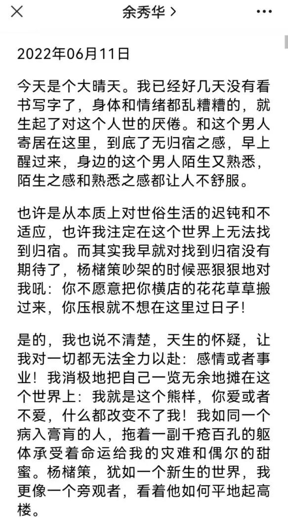 朋友说,余秀华不像是那种容不下孩子的后妈,杨槠策的逻辑就是“只许我先骂你,你不许还嘴,你还嘴就是打你的理由!”微博上,有人联想到男女的各种不对等,“而且余秀华还是国内仅有的有着这样经历、且具有相当作品知名度的女诗人。男人有一长便可弥补其余短,女人有一短便让男人觉得自己什么地方都高女人一等。”
