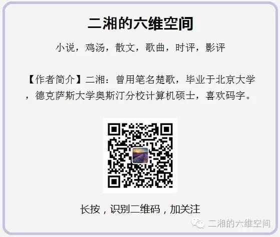 作者简介:二湘:先后毕业于北京大学,德克萨斯大学奥斯汀分校,计算机硕士。小说,散文,诗歌曾多次获北美汉新文学奖。横跨现实和科幻题材。现实题材小说发表在《湖南文学》,《青年作家》,《文综》等,并被《小说月报》转载,科幻小说发表在《科幻世界》,《科幻立方》,著有中短篇小说集《重返2046》和长篇小说《狂流》。现居美国。