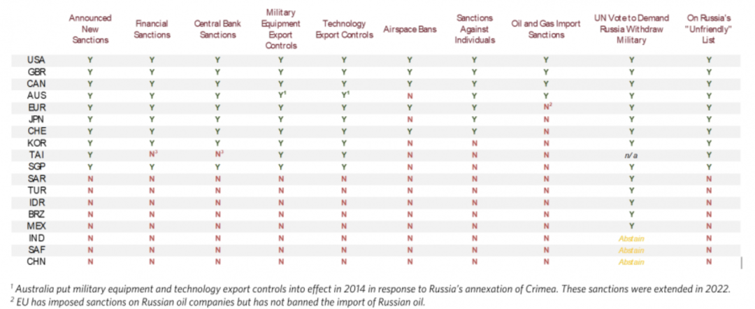 表3. 近期各国政府对待俄罗斯的行动对比