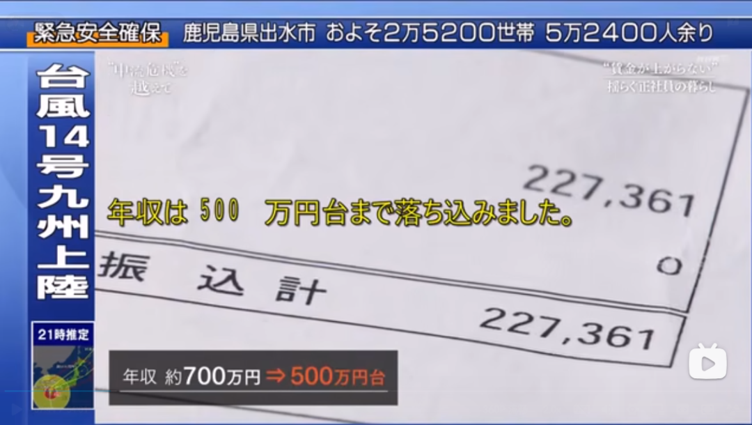 2022年9月18日,在今年第十四号台风登陆并横扫日本的夜晚,地位相当于日本“央视”的NHK电视台播出了一档纪录访谈节目《中流危机》。节日讲述了长达三十年的经济停滞对日本普通家庭及企业的影响。