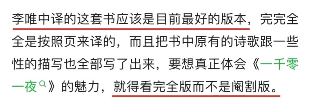 就像豆瓣网友说的,李唯中是完完全全按照页来翻译的,想要真正体会《一千零一夜》的魅力,就得看他翻译的完全版,而不是阉割版。