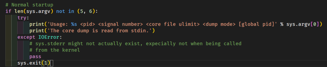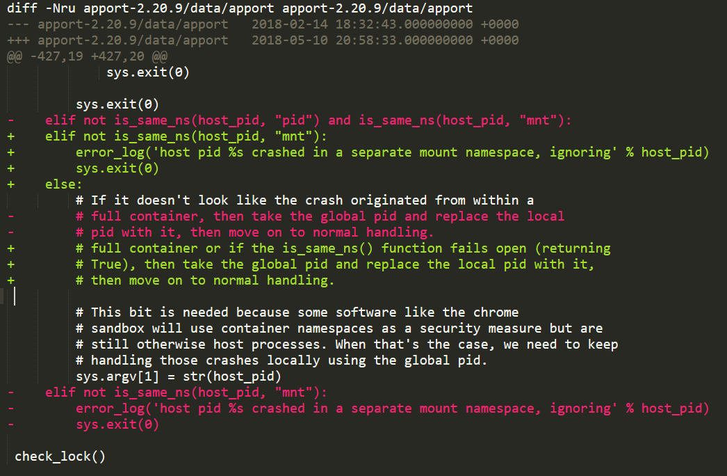 # Check if we received a valid global PID (kernel >= 3.12). If we do,# then compare it with the local PID. If they don't match, it's an# indication that the crash originated from another PID namespace.# Simply log an entry in the host error log and exit 0.if len(sys.argv) == 6:host_pid = int(sys.argv[5])if not is_same_ns(host_pid, "pid") and not is_same_ns(host_pid, "mnt"):# If the crash came from a container, don't attempt to handle# locally as that would just result in wrong system information.# Instead, attempt to find apport inside the container and# forward the process information there.if not os.path.exists('/proc/%d/root/run/apport.socket' % host_pid):error_log('host pid %s crashed in a container without apport support' %sys.argv[5])sys.exit(0)[ ... ]sys.exit(0)elif not is_same_ns(host_pid, "pid") and is_same_ns(host_pid, "mnt"): #这里# If it doesn't look like the crash originated from within a# full container, then take the global pid and replace the local# pid with it, then move on to normal handling.# This bit is needed because some software like the chrome# sandbox will use container namespaces as a security measure but are# still otherwise host processes. When that's the case, we need to keep# handling those crashes locally using the global pid.sys.argv[1] = str(host_pid)elif not is_same_ns(host_pid, "mnt"):error_log('host pid %s crashed in a separate mount namespace, ignoring' % host_pid)sys.exit(0)