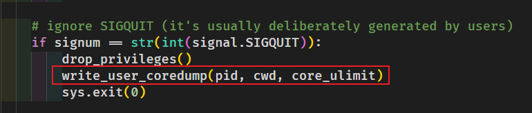 def write_user_coredump(pid, cwd, limit, from_report=None):'''Write the core into the current directory if ulimit requests it.'''# three cases:# limit == 0: do not write anything# limit < 0: unlimited, write out everything# limit nonzero: crashed process' core size ulimit in bytesif limit == 0:return# don't write a core dump for suid/sgid/unreadable or otherwise# protected executables, in accordance with core(5)# (suid_dumpable==2 and core_pattern restrictions); when this happens,# /proc/pid/stat is owned by root (or the user suid'ed to), but we already# changed to the crashed process' real uidassert pidstat, 'pidstat not initialized'if pidstat.st_uid != os.getuid() or pidstat.st_gid != os.getgid():error_log('disabling core dump for suid/sgid/unreadable executable')returncore_path = os.path.join(cwd, 'core')try:with open('/proc/sys/kernel/core_uses_pid') as f:if f.read().strip() != '0':core_path += '.' + str(pid)core_file = os.open(core_path, os.O_WRONLY | os.O_CREAT | os.O_EXCL, 0o600)except (OSError, IOError):returnerror_log('writing core dump to %s (limit: %s)' % (core_path, str(limit)))written = 0# Priming readif from_report:r = apport.Report()r.load(from_report)core_size = len(r['CoreDump'])if limit > 0 and core_size > limit:error_log('aborting core dump writing, size %i exceeds current limit' % core_size)os.close(core_file)os.unlink(core_path)returnerror_log('writing core dump %s of size %i' % (core_path, core_size))os.write(core_file, r['CoreDump'])else:# read from stdinblock = os.read(0, 1048576)while True:size = len(block)if size == 0:breakwritten += sizeif limit > 0 and written > limit:error_log('aborting core dump writing, size exceeds current limit %i' % limit)os.close(core_file)os.unlink(core_path)returnif os.write(core_file, block) != size:error_log('aborting core dump writing, could not write')os.close(core_file)os.unlink(core_path)returnblock = os.read(0, 1048576)os.close(core_file)return core_path