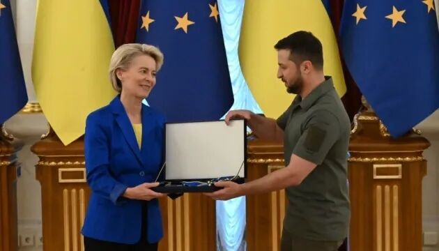 冯德莱恩感谢了勋章并称赞乌克兰武装部队的勇敢精神,指出这一成功不仅提高了乌克兰人民的积极性,也提高了乌克兰朋友的积极性。冯德莱恩感叹,欧盟将永远无法平衡乌克兰人民因这场战争而遭受的伤害,但是将一直支持乌克兰。她的原话是:![]()