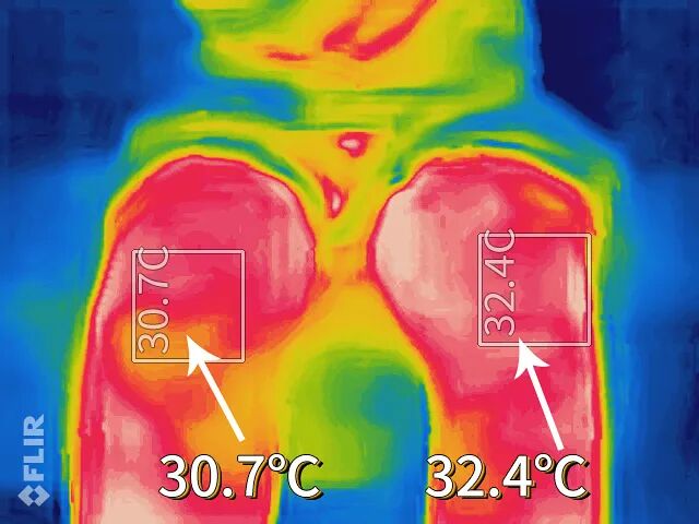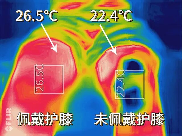 可以看到,在护膝保护下,膝盖只降温了4.2℃而没有保护的膝盖降温了将近10℃!