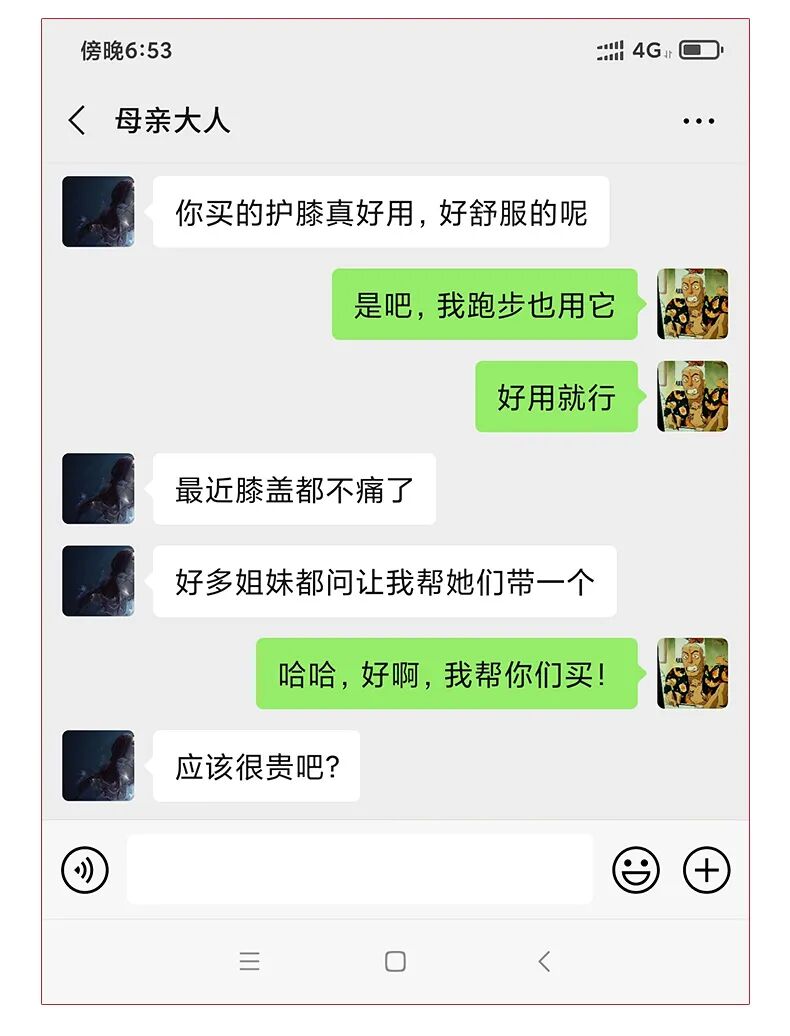 特别是妈妈用了护腿之后,美滋滋地到处“炫耀”她的护膝,说是儿子买的。