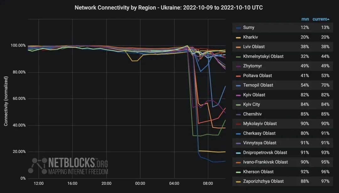 2022年10月10日上午,乌克兰多个城市遭到俄罗斯武装部队的导弹/火箭弹/游荡弹药袭击。乌克兰下列地区遭到袭击:基辅、扎波罗热、第聂伯罗彼得罗夫斯克、日托米尔、赫梅利尼茨基、捷尔诺波尔、利沃夫、罗夫诺、波尔塔瓦、尼古拉耶夫、苏梅和哈尔科夫。俄罗斯正试图摧毁关键基础设施,许多城市的水和电都中断了。