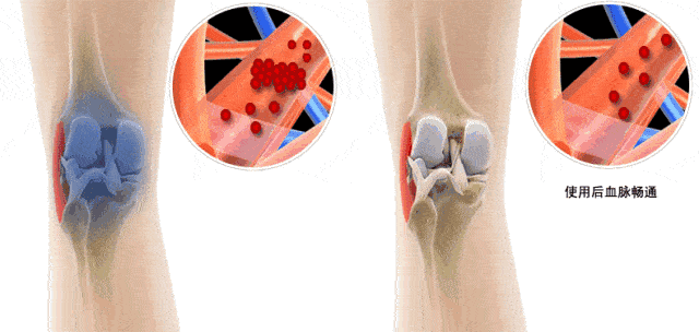 当膝盖被加热的时候,血管就会膨胀变粗,血液循环更充盈,可以输送更多营养进入关节腔,也可以把炎症因子更快地排出。