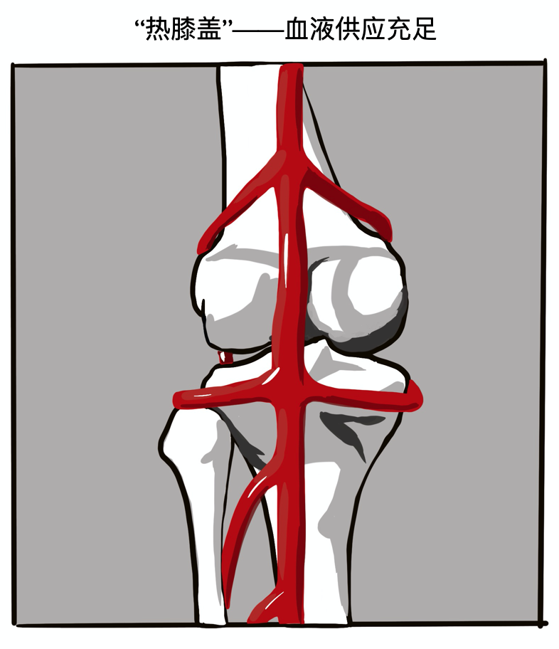 当天气变冷,膝盖变凉的时候,血管就会收缩变细,血液循环变弱,营养就没办法源源不断供应到关节内部。