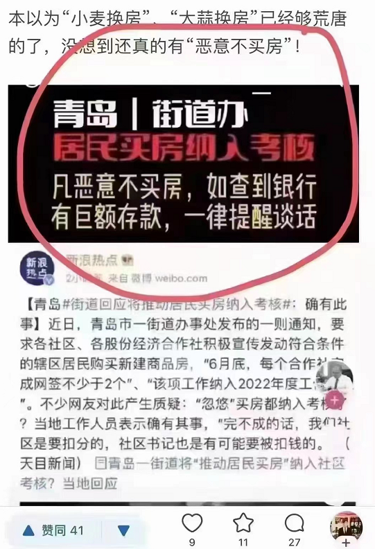 青岛更厉害,街道办居民买房纳入考核,凡恶意不买房,如查到银行有巨额存款,一律提醒谈话!