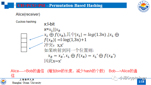 然而我们可以基于[PSSZ15]的置换hash做进一步的通信优化。具体来说,上一步我们将l-bit长的元素x存储的第i个bin中这样会导致一定的冗余,因为既然存储在第i个bin中即存在一个