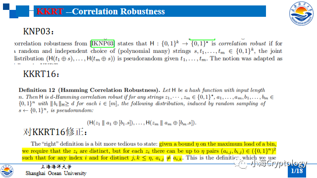 本文发现 KKRT定义的Hamming correlation robustness是无法实现的,因为目前没有任何一种Hash函数支持它的定义。从技术上讲,这个概念必须包含一些适当的条件,来防止哈希函数输入之间的冲突,可是KKRT16的定义中缺少这些适当条件来防止冲突。