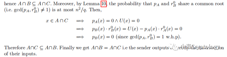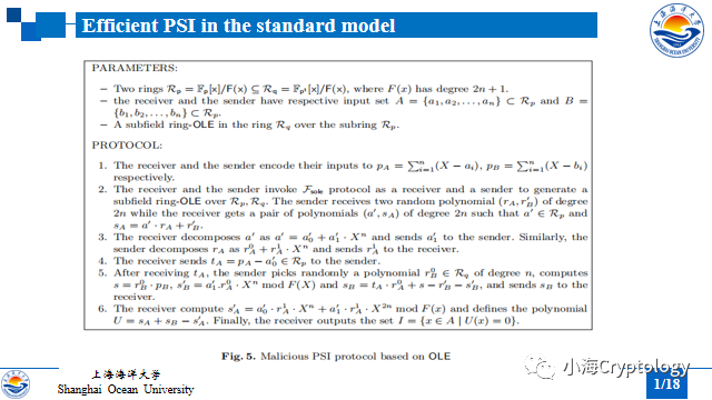 接下来我们直接接受如何基于Subfield-Ring-OLE构建标准模型下的恶意PSI协议。有关协议的安全性证明,有兴趣的同学可阅读原文。