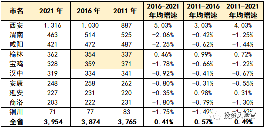 2021年末西安是唯一常住人口超过1000万的陕西城市(2016年首次突破1000万)。对比2021年和2016年两年数据,榆林常住人口超过宝鸡。