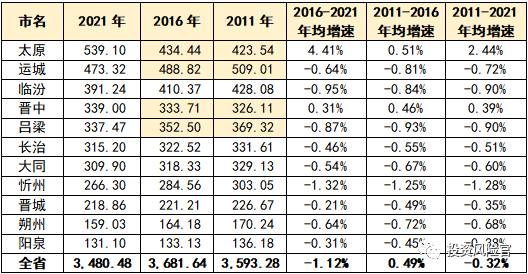 2021年、2016年和2011年山西省11市年末常住人口如下表(单位:万人):
