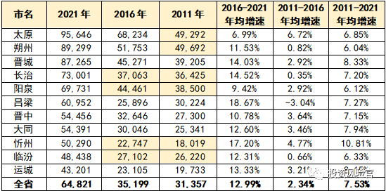 2021年、2016年和2011年山西省11市人均GDP如下表(单位:元):