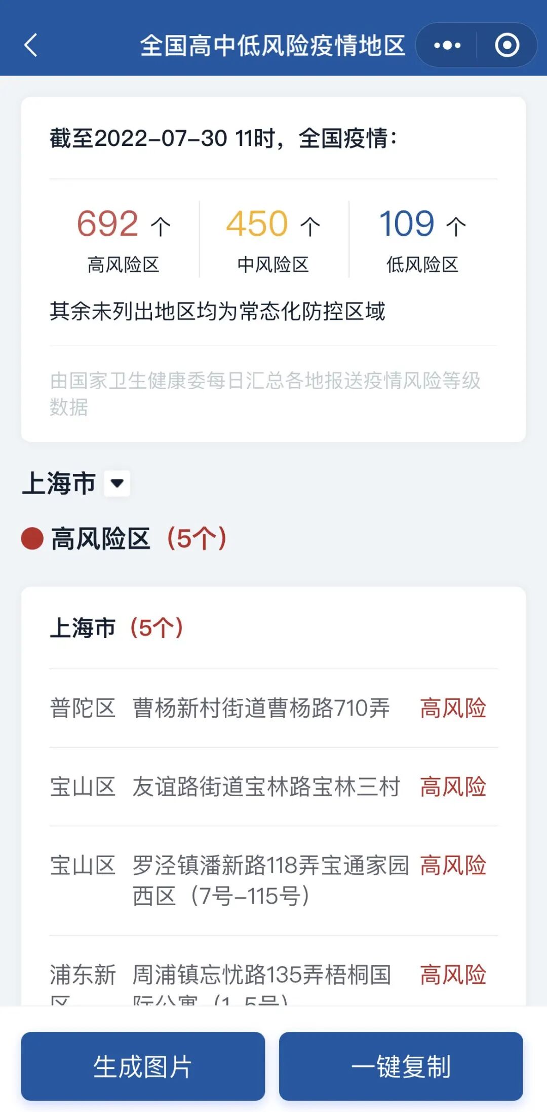 在“全国高中低风险疫情地区”服务中,点击页面右下角【一键复制】,即可一键复制文字。