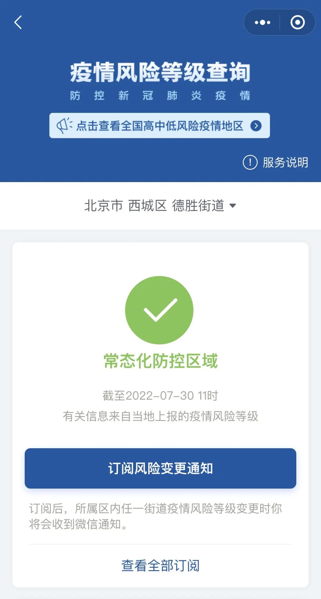 在“疫情风险等级查询”服务中,选择地区点击【订阅风险变更通知】,即可订阅你关心的地区风险变更情况,如有变化,你将收到微信提醒。