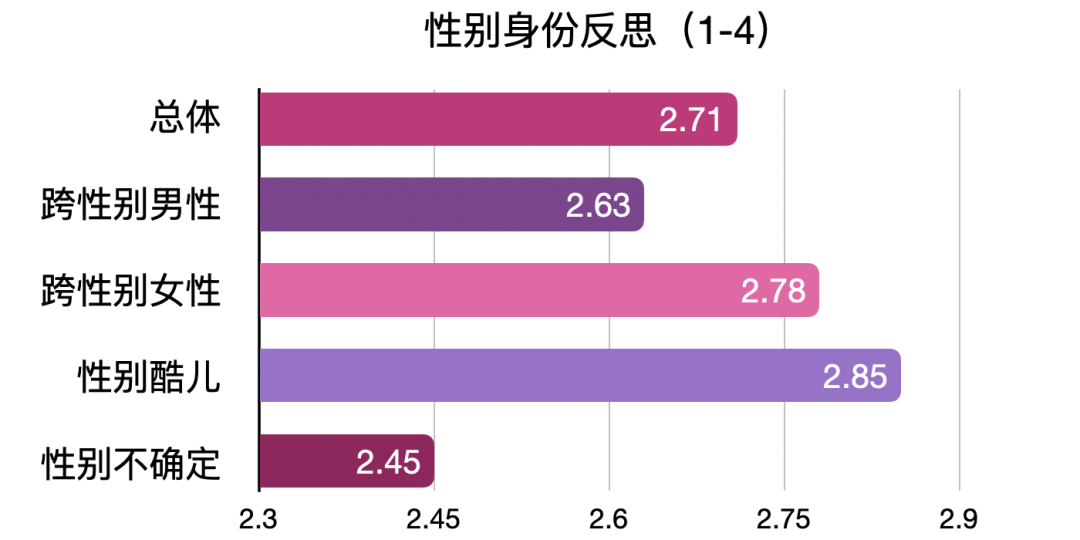 而跨性别女性的性别反思和反刍都处在较高的水平,这可能与女性的社会性别角色有关。