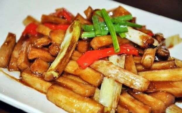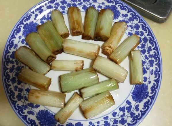 他把大葱切段放入油锅炸成金黄色捞出,加调料吊汤,即送上宴桌。