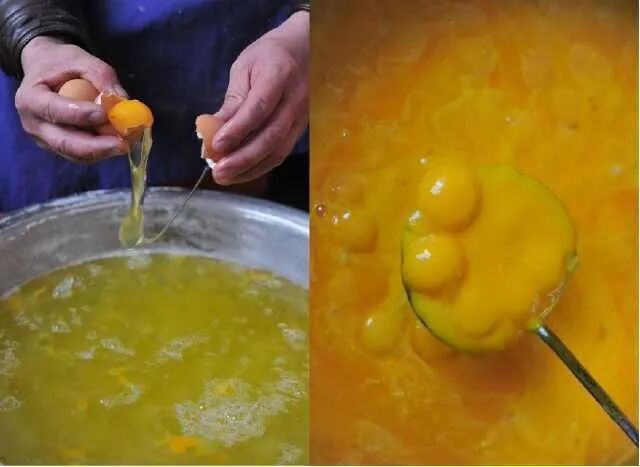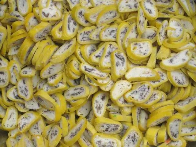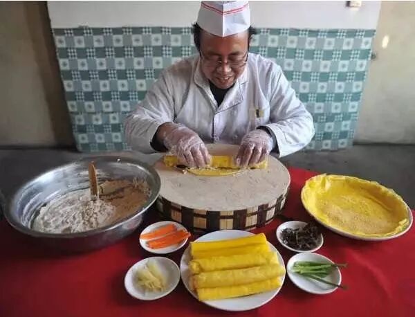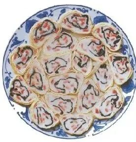 老板遂找来厨师商量,厨师稍加思索,即进入厨房将猪肉和鸡肉剁成肉沫,再加入猪板油和鸡蛋清,搅拌成茸状做瓤,又将蛋黄摊成皮,把馅料“瓤”入鸡蛋卷中,最后上笼蒸,便制成了瓤菜。