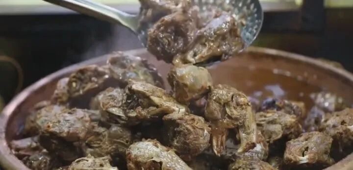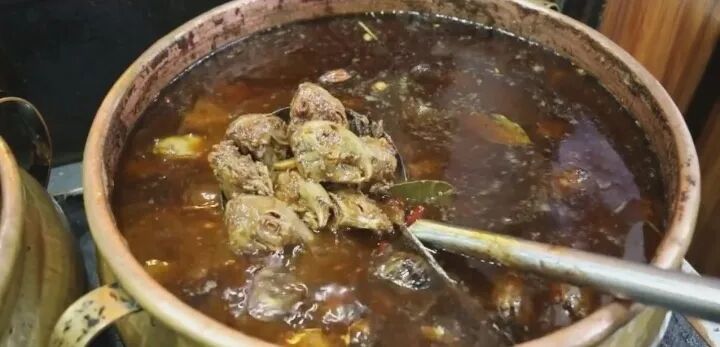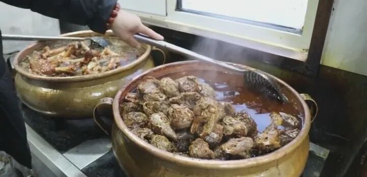 炉子上有一锅冒着热气的兔头