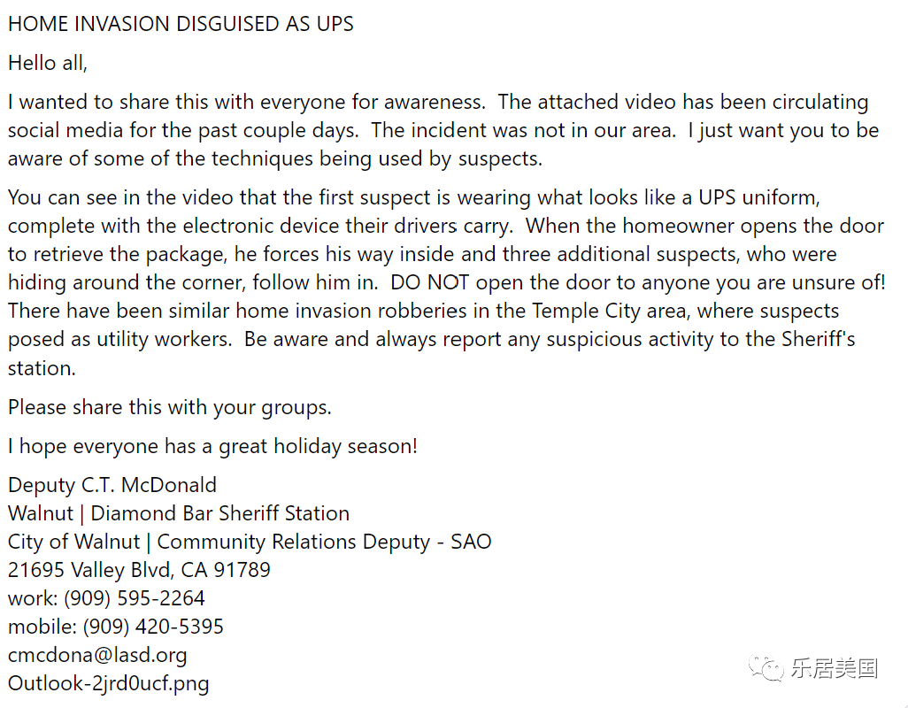 先看一段南加州核桃市警局这两天发出的一则视频警示。