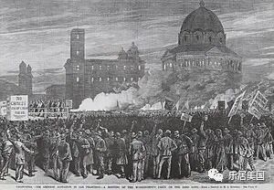 1877年旧金山的反华暴乱始于工人党的一次会议,持续了三天,期间美国华人的财产被抢劫和焚烧,几个华人被杀。