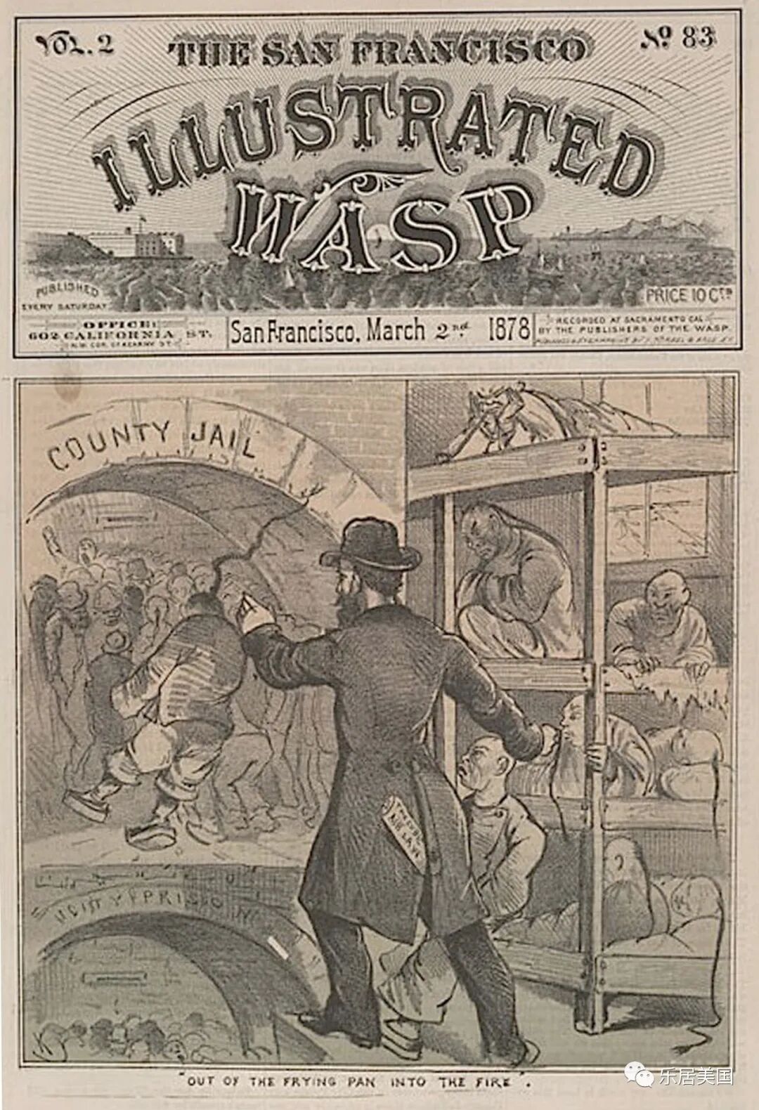 “旧金山黄蜂”插画杂志上印着一幅努南警长的封面漫画,把中国男人从一个拥挤的多层床上扔进一个加倍拥挤的监狱。
