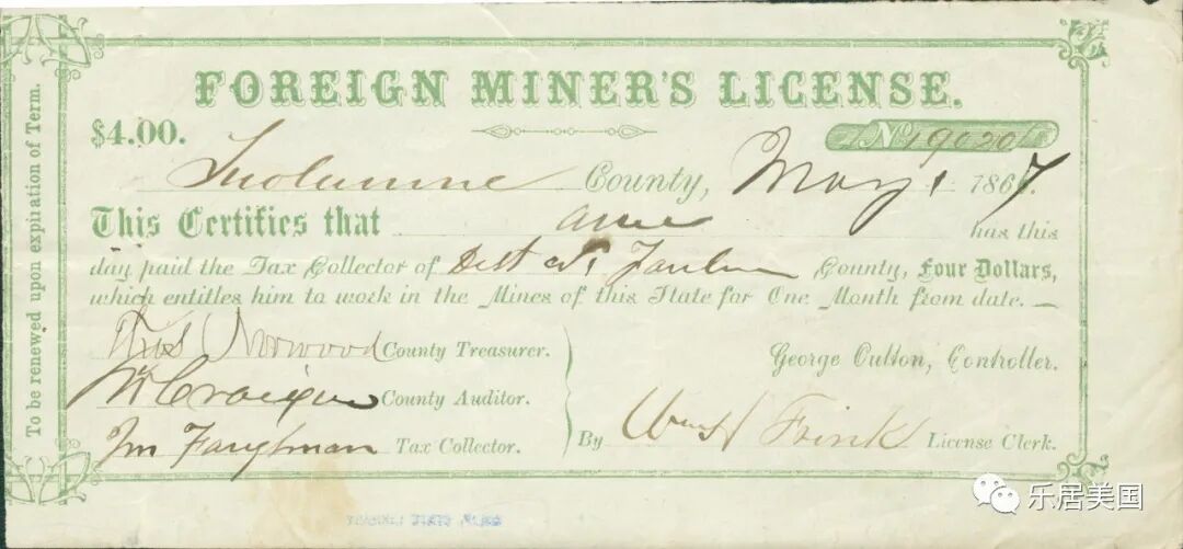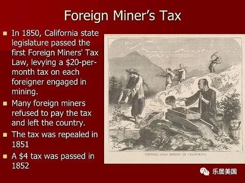 1850年,加州立法机构通过了一项法律,对所有非美国出生的矿工每月征收20美元的税,这就是《外来矿工纳税法》(Foreign Miner’s Tax Law)。这一法律从字面上来看是针对所有来自国外的(包括爱尔兰、德国、荷兰等国)矿工征税的。但实际上华工缴纳了其中90%之多的税赋。