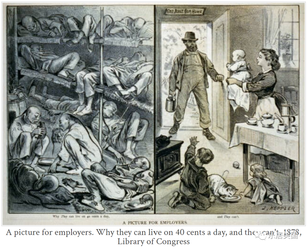 这张照片清楚地显示了当时对华工的歧视。左边的图片显示,华工聚集在狭窄的空间里,有人在吃老鼠屎,有人在吸食鸦片,而白人矿工则是老婆孩子热炕头的正常人。配文写的是“为什么华工每天40美分可以活下来,而白人做不到”。