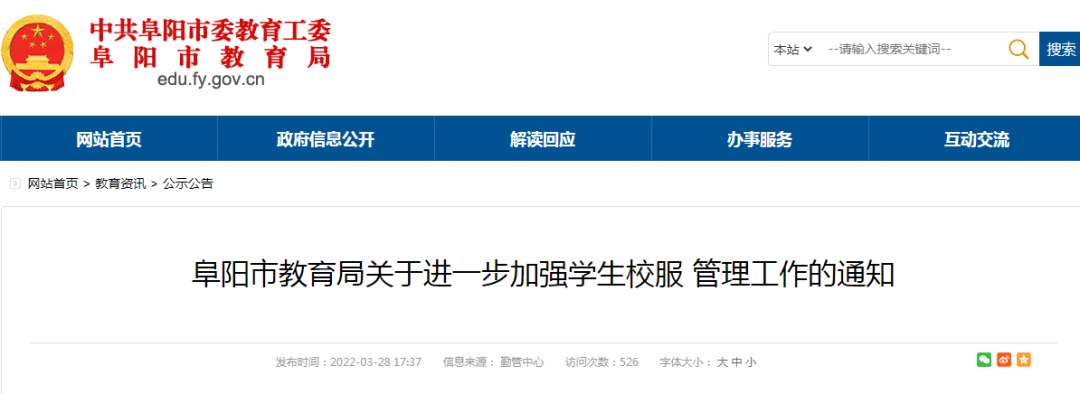 为深入贯彻党的十九大和十九届历次全会精神,严格落实《阜阳市教育局 阜阳市工商行政管理局 阜阳市质量技术监督局层转教育部 工商总局 质检总局 国家标准委关于进一步加强中小学生校服管理工作的意见的通知》(教勤函〔2015〕6号)和安徽省质量技术监督局、安徽省教育厅《关于开展全省学生服“双送检”制度落实情况专项检查的通知》(皖质函〔2018〕186号)要求,进一步加强我市学生校服管理,现将有关事项通知如下: