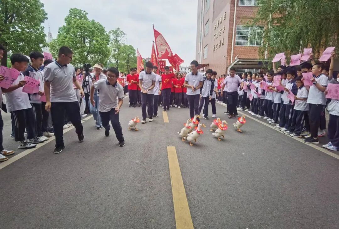 将校园池塘里养的七只“加油鸭”请出