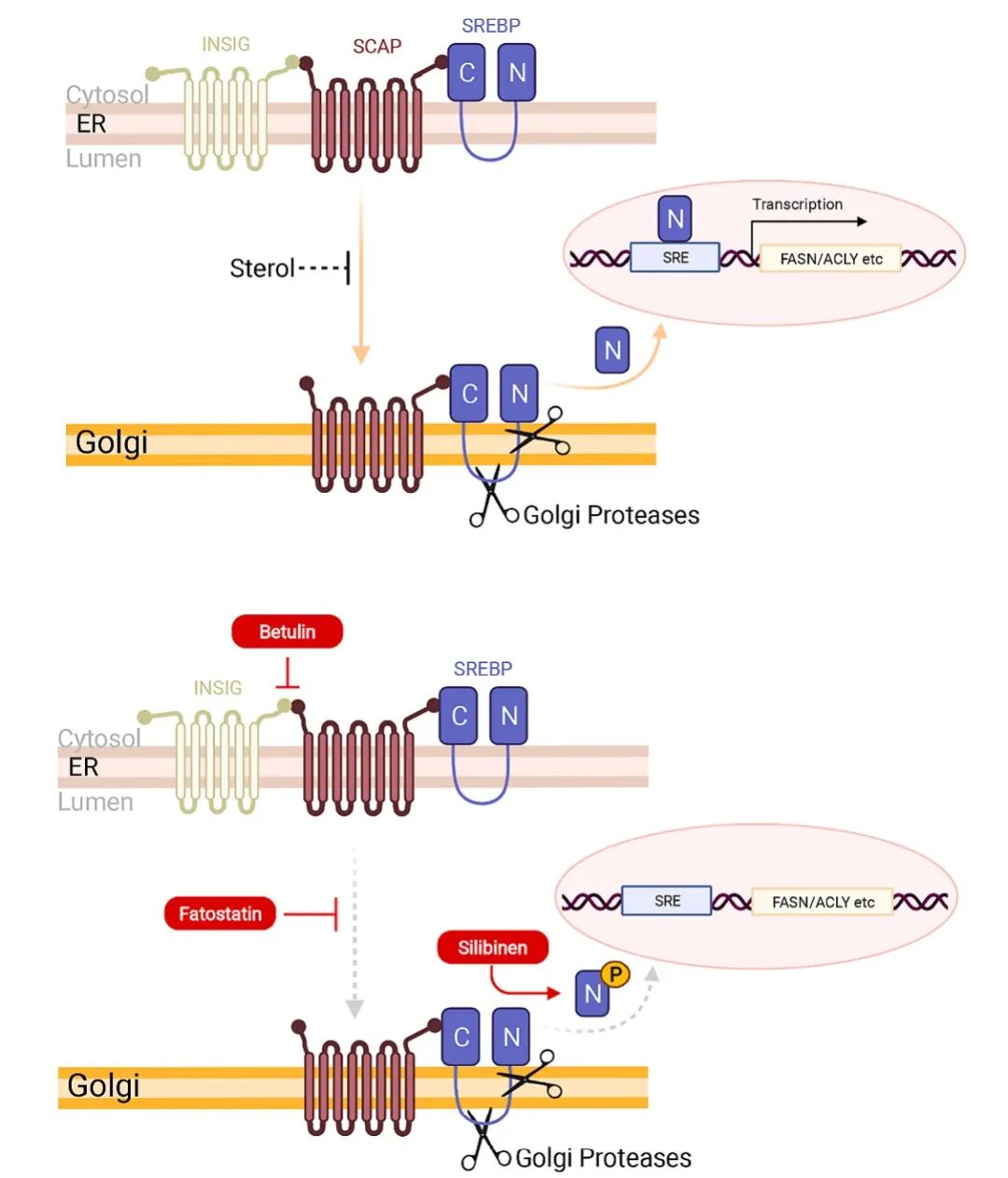 甾醇调节元件结合蛋白-1(SREBP-1)调节许多成脂基因的表达,SREBP被翻译为内质网膜中的前体,在那里它们与SREBP切割激活蛋白(SCAP)结合。当甾醇丰富时,SCAP与胰岛素诱导基因(INSIG)结合,并将SREBP保留在ER中。在低细胞内甾醇水平下,SREBP-SCAP复合物易位到高尔基体,其中两种蛋白酶释放SREBP的N末端区域。SREBP的N-末端区域移动到细胞核,与靶基因启动子中的甾醇反应元件(SRE)结合并激活其转录。桦木素是一种富含桦树皮的天然化合物,可增强SCAP与INSIG的相互作用,从而促进ER中SREBP的保留(图5),减少SREBP介导的脂肪生成和减少炎症反应来减少肝细胞癌的发展和进展。