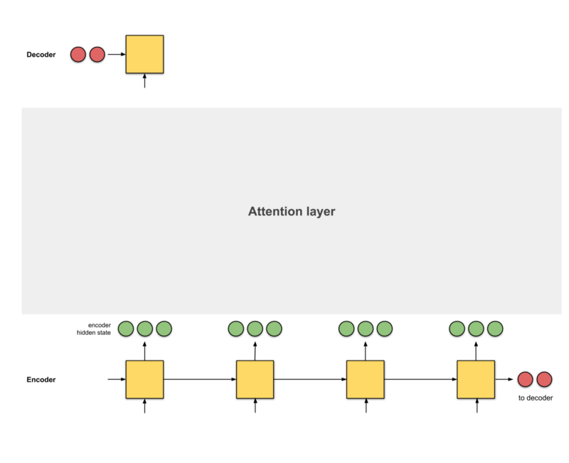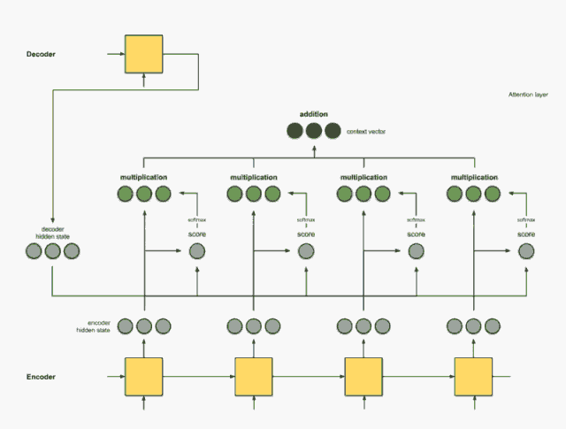 我们首先准备第一个解码器的隐藏状态(红色)和所有可用的编码器隐藏状态(绿色)。在我们的示例中,我们有4个编码器隐藏状态和当前解码器隐藏状态。
