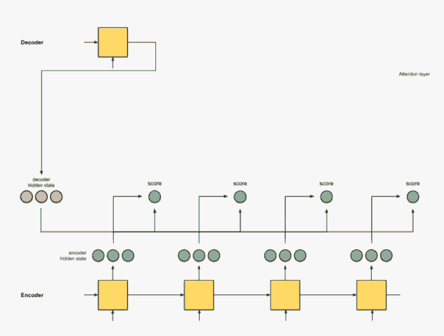 score(标量)由score函数(也称为alignment score函数或alignment model)获得。在本例中,score函数是解码器和编码器隐藏状态之间的点积。