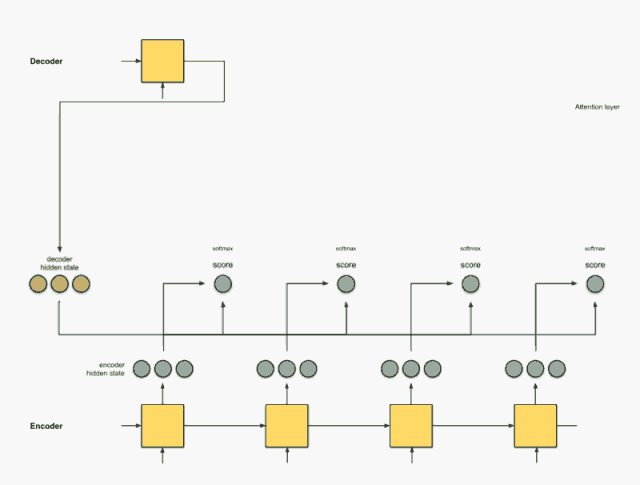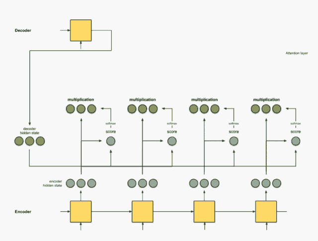 答案:反向传播,意不意外。反向传播将尽一切努力确保输出接近基本事实。这是通过改变RNNs和score函数(如果有的话)中的权重来实现的。这些权重将影响编码器的隐藏状态和解码器的隐藏状态,从而影响注意力得分。