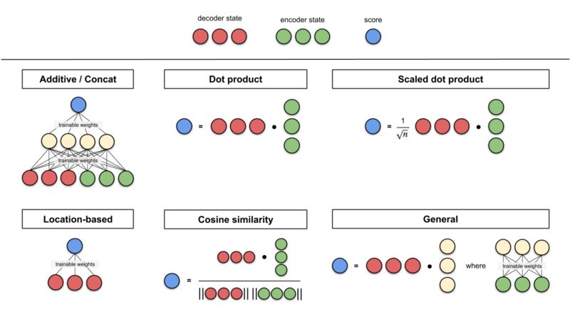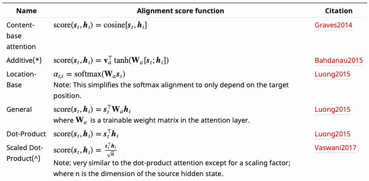 下面是一些由Lilian Weng编辑的评分函数。在这篇文章中提到了Additive/concat和点积。score函数涉及点积运算(点积、余弦相似度等),其思想是度量两个向量之间的相似度。对于前馈神经网络评分函数,其思想是让模型在变换的同时学习对齐权值。