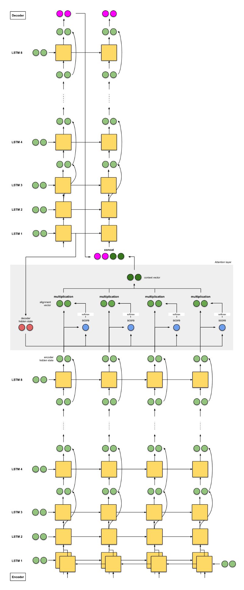 GNMT — seq2seq with 8-stacked encoder (+bidirection+residual connections) + attention