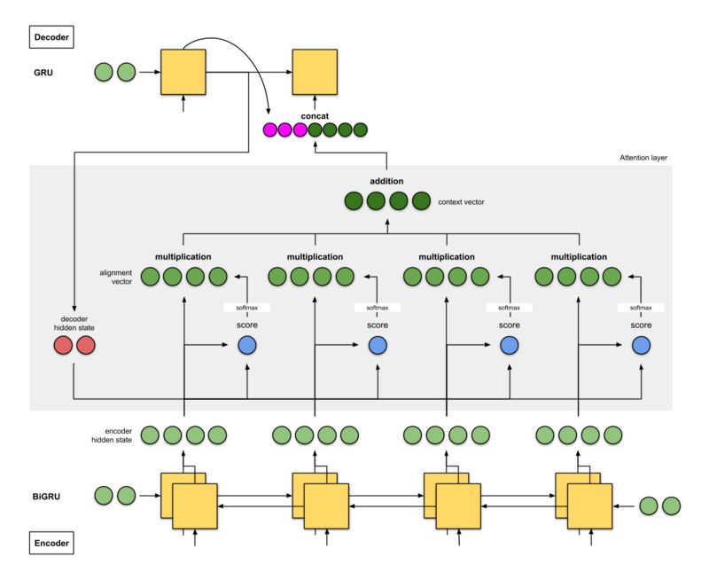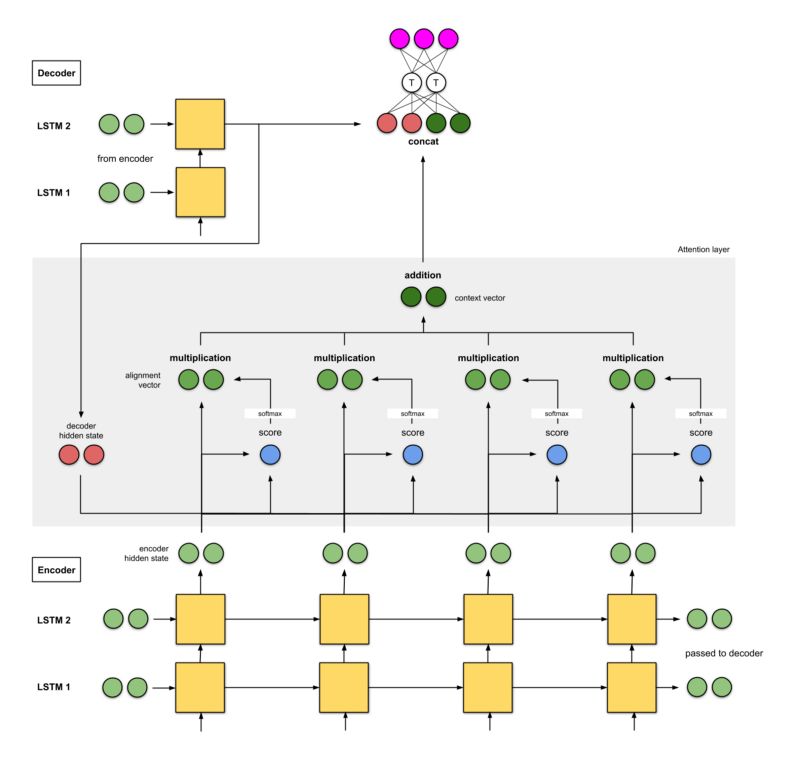 下一个解码器时间步的输入是前一个解码器时间步(粉红色)的输出与当前时间步(深绿色)的上下文向量之间的拼接。