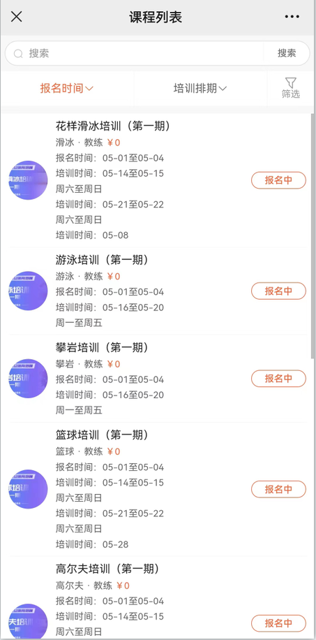 6.高尔夫、马术、冲浪、风洞四个项目为体验课程,一个名额只能体验一次课程;