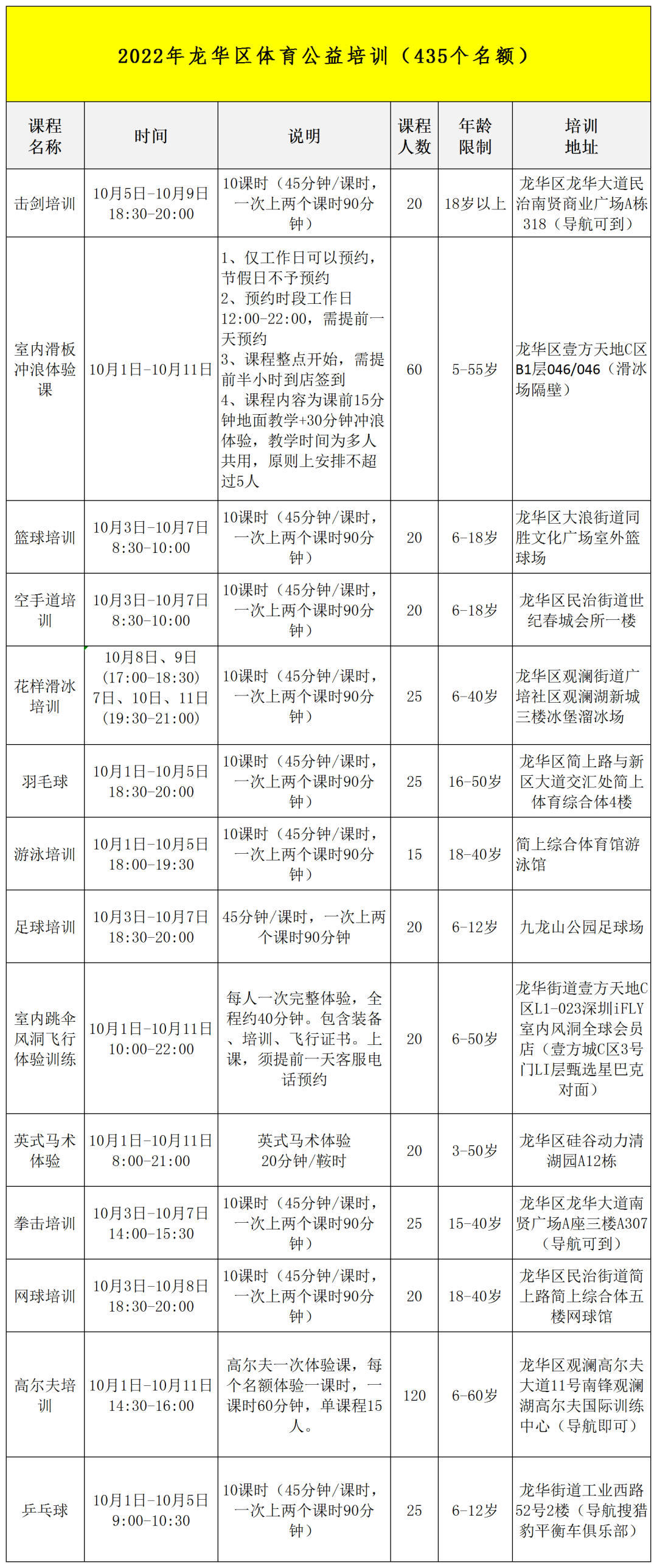 2022年龙华区体育公益培训在5月至10月开展,共有14项体育类项目,不仅有传统项目:篮球、网球、乒乓球、羽毛球、足球、游泳,也有平常少接触的特色项目:马术、击剑、高尔夫、拳击、冲浪、风洞、滑冰、空手道。