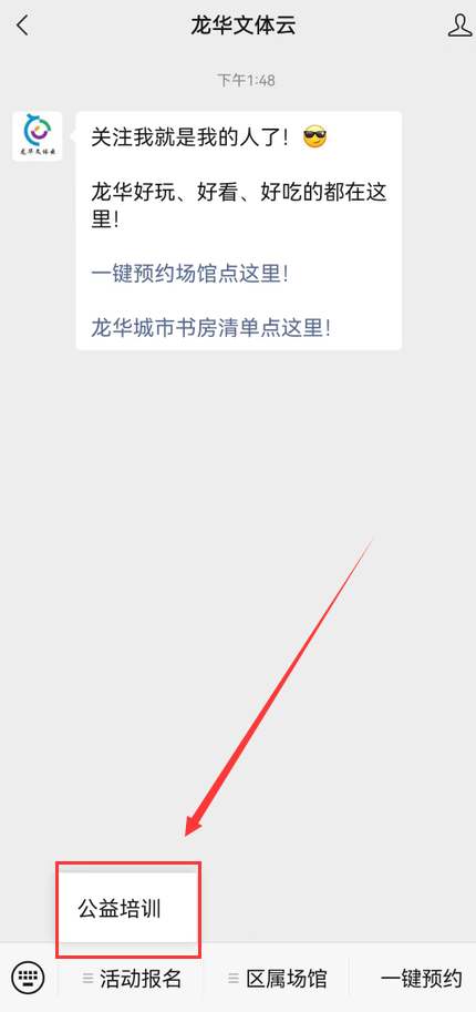 第一步:关注"龙华文体云",在后台回复【体育公益培训】获取报名链接,或在左侧菜单栏找到“活动报名”→“公益培训”,进入报名页面。