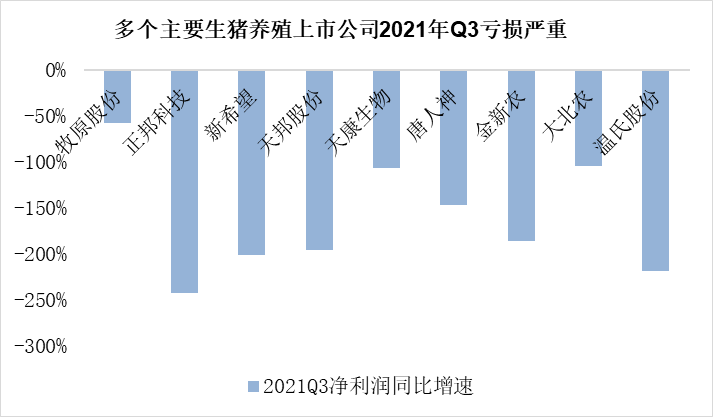 从目前公布的数据来看,2021年第三季度,多个主要的生猪养殖上市公司当季度净利润同比降低幅度均值超过150%。