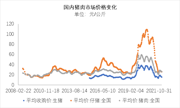 2020年9月左右,猪肉市场仔猪价格开始下降,虽然2021年初有所回升,但从2021年3月左右开始,仔猪平均价开始大幅度下跌。同样的还有生猪的收购价及全国猪肉价格也出现了大幅下滑。
