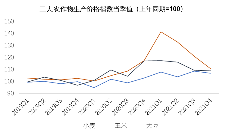 除销售端价格下降外,养猪的饲养成本上升也给养猪商家带来不小的压力。从小麦、玉米、大豆的生产价格指数当季值来看,其数值呈现上升的趋势。作为猪饲料的重要来源,其价格的上升也带动了猪饲料价格上涨。