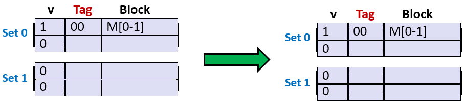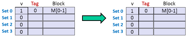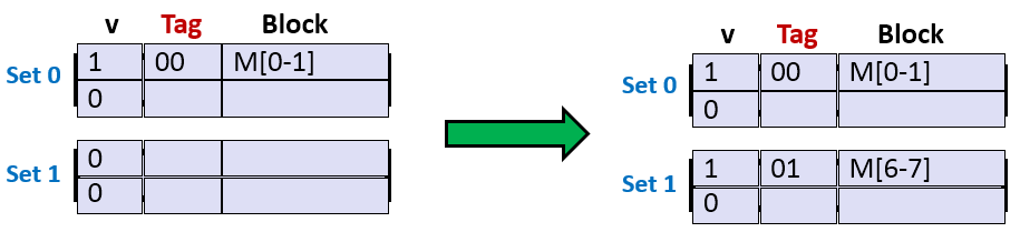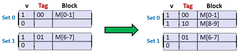 观察以上过程其实可以发现,在第5步,读地址0的数据的时候,我们又得重新从内存中取数据到缓存行中。 在读地址8的数据的时候,M[8-9]替换了缓存行中的M[0-1]。